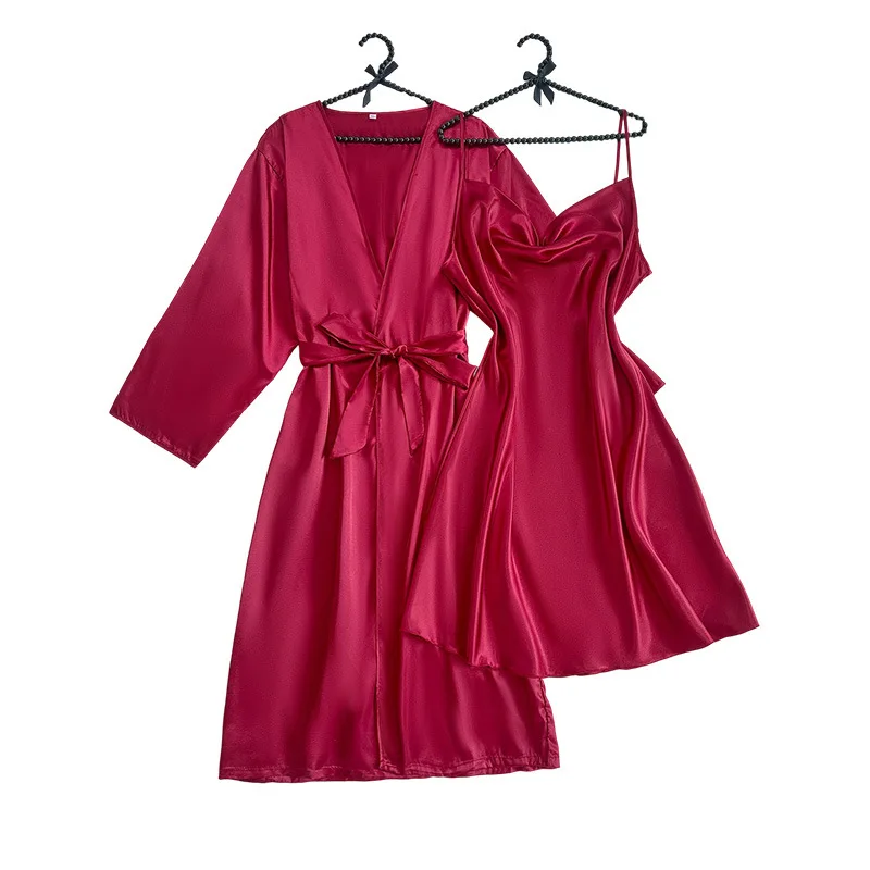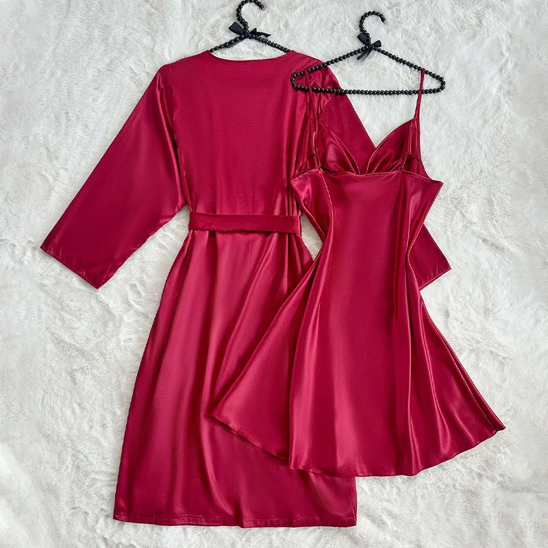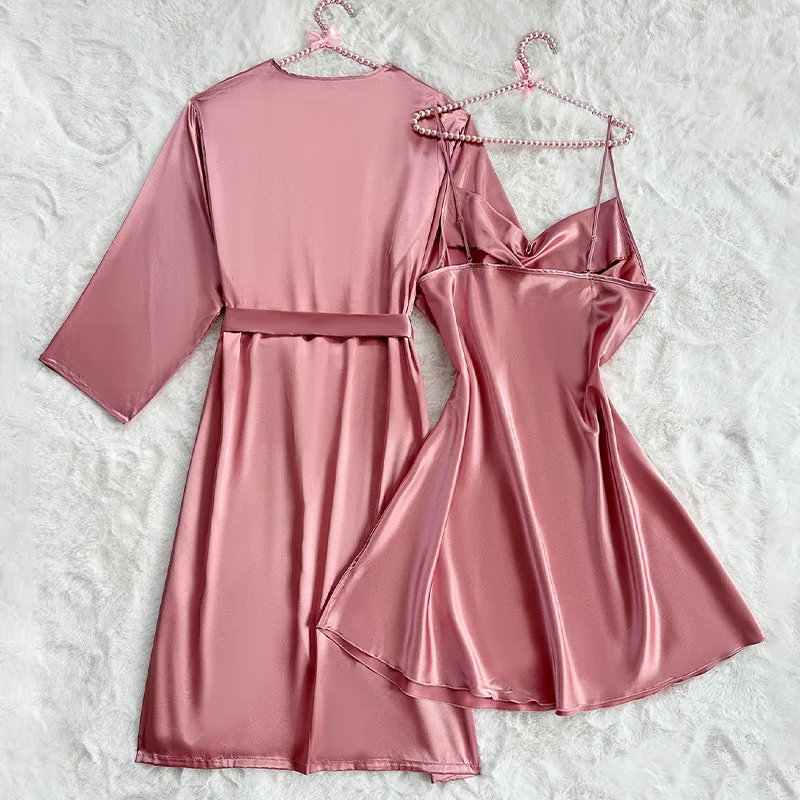 European American Cross-Border Long Camisole Nightdress Coat Sexy Satin Homewear Set Elastic Waist Elegant Summer